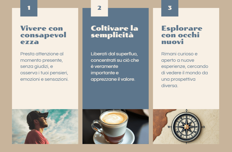 Esempio pratico: Prova a dedicare 10 minuti al giorno alla meditazione o alla scrittura di un diario, per riflettere sulle tue emozioni e sui tuoi obiettivi. - Coltivare la semplicità Dopo aver vissuto negli eccessi del mondo occidentale, Terzani trovò pace nelle pratiche e nelle filosofie orientali. Credeva nella bellezza della semplicità: “”Le cose più importanti sono quelle che non si possono comprare: il silenzio, il tempo, l’amore.” Esempio pratico: Prova a dedicare una giornata alla “semplicità”: spegni il telefono, cammina nella natura e concentrati sulle piccole cose, come il profumo dei fiori o il suono del vento.